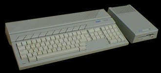 Atari 520ST mit passendem Diskettenlaufwerk. Man kann den Rechner sowohl an den Fernseher, wie auch den weiter unten abgebildeten Monitor anschließen. Das Betriebssystem paßt die Auflösung des Desktop automatisch an.