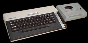 sich auf 128 kB ausbauen. Für den Sound standen vier Tongeneratoren zur Verfügung. In der Abbildung ist eine Datasette als Massenspeicher mit abgebildet. Alternativ gab es auch noch ein Floppy-Laufwerk mit einer sehr geringen Speicherkapazität. |