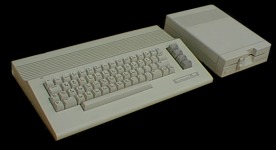 einer Auflösung von 320x200 Bildpunkten angeboten wurden. Für die Firma Commodore war der C64 ein enormer Erfolg. Mit den 8-Bit Nachfolgern dieses Gerätes hatte Commodore allerdings ein weniger glückliches Händchen. Erst der Amiga brachte nochmal einen Aufschwung, bevor Commodore, teilweise aufgrund von Managementproblemen, für immer in der Versenkung verschwand. Auf dem Bild ist der C64 II mit der Floppy 1541 II zu sehen. Die ersten Versionen waren etwas dunkler und runder (siehe Bilder weiter unten). Sie wurde deshalb auch oft als Brotkasten bezeichnet. Ich wage die Behauptung, daß