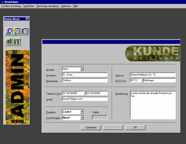 Hier zwei verkleinerte Abbildungen von WeinAdmin während der Eingabe eines Kunden und der Erstellung einer Rechnung.